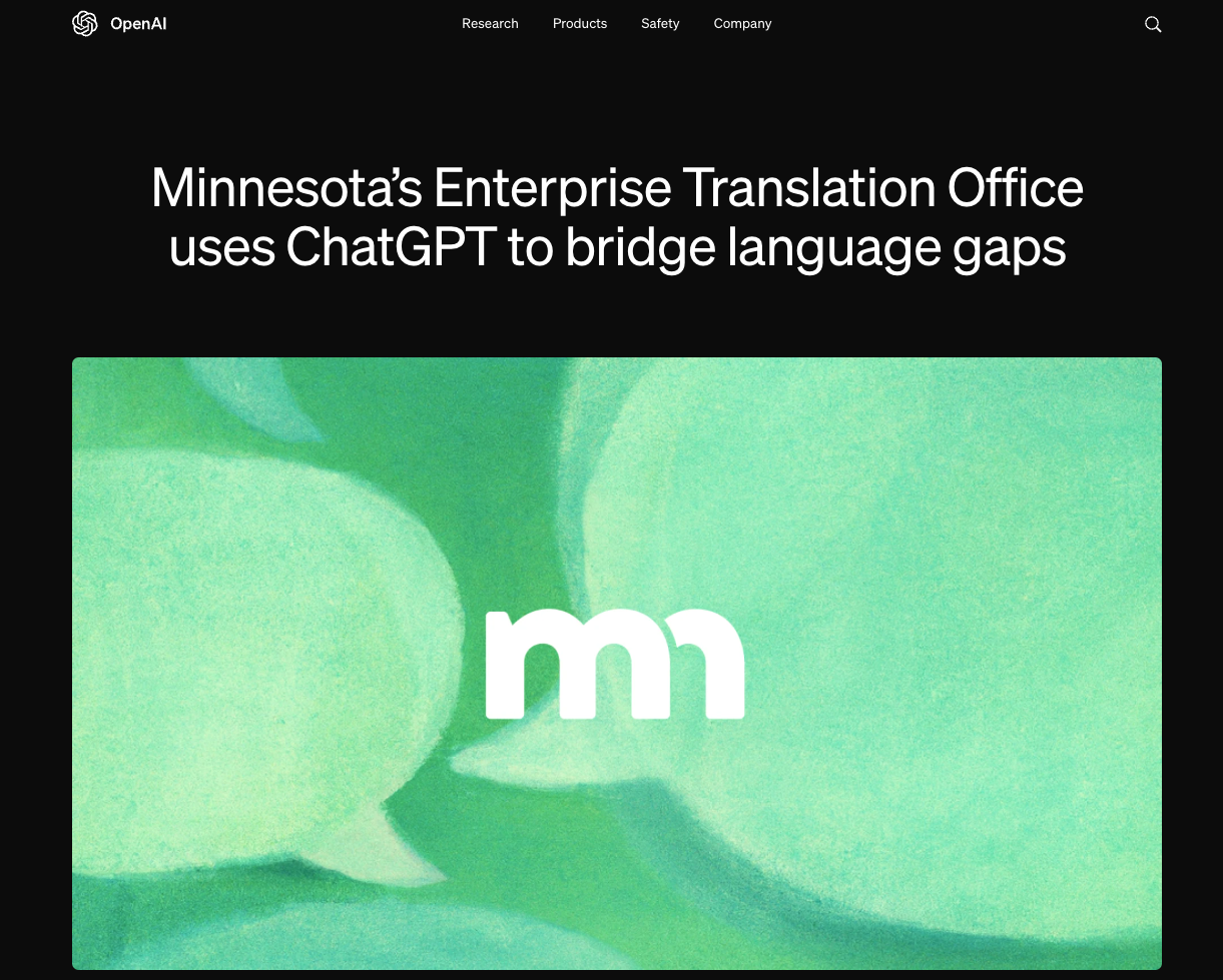 미네소타 주정부는 OpenAI와 협력하여 AI 기반 번역 시스템을 구축했어요. 한 달 걸리던 번역이 48시간 내로 단축되었고, 긴급한 경우 2시간 이내 처리도 가능해졌습니다. 현재 월 300만 단어 이상을 처리하고 있으며, 영어, 스페인어, 소말리어 등 다양한 언어를 지원합니다.