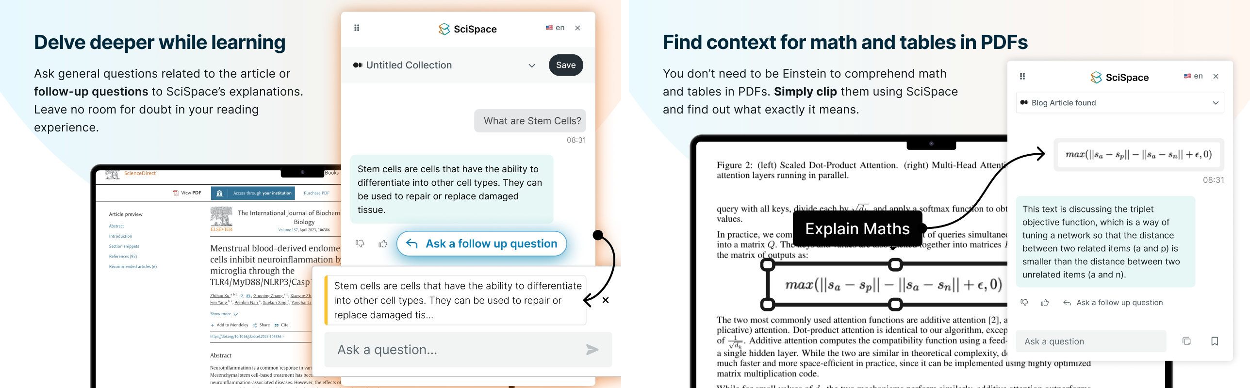 SciSpace는 전문 용어로 작성된 내용을 이해하기 쉽게 설명해주며, 채팅 기능을 통해 논문의 내용을 꼼꼼하게 이해할 수 있습니다. PDF도 인식해서 논문 속 수식을 선택하면 해당 수식을 분석해서 설명해주는 기능도 제공합니다. 한국어를 포함해서 정말 다양한 언어를 지원하기 때문에 편하게 사용할 수 있을 것 같아요!