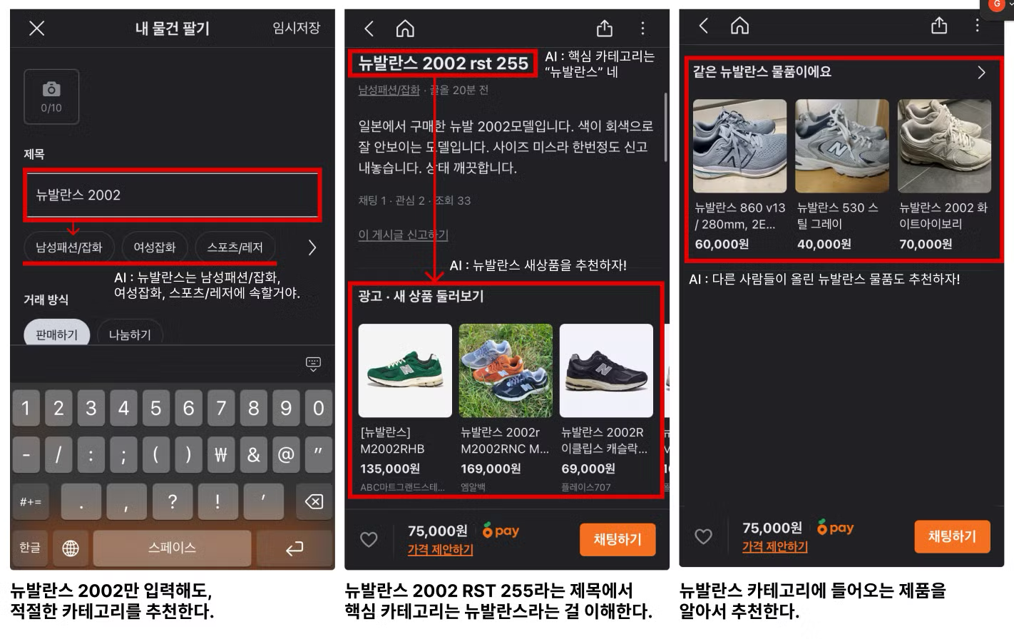 - AI 사용 : AI가 상품의 카테고리를 찰떡 같이 분류할 수 있게 만들었어요. 뉴발란스 2002 RST 255라는 제목의 상품이 올라왔을 때, 핵심 카테고리는 뉴발란스라고 정의해줘요. 카테고리가 분류되어서 비슷한 상품을 추천하는 것도 가능해졌고요. 덕분에 광고 효율이 높아졌을 것으로 추정됩니다.