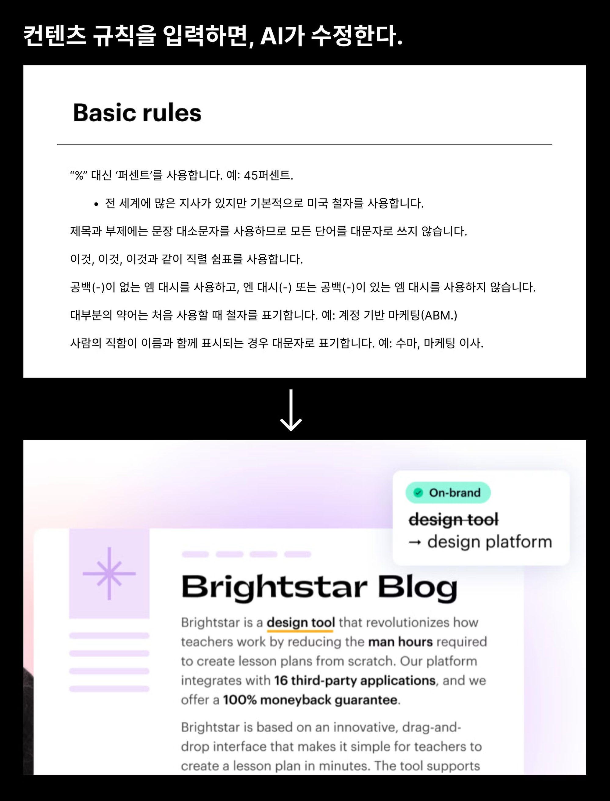 - 상황 : 회사가 커지면서 글을 쓰는 구성원들이 많아졌어요. 제품 FAQ부터 기술 블로그, 비즈니스 블로그, 고객사 스토리까지요. 그런데 각자 다른 용어를 사용해 커뮤니케이션은 어려워 졌고요. 일관성이 필요해 졌어요. 그렇다고 구성원들에게 알아서 가이드라인에 맞춰 쓰라고 하는 건 어려운 일이였습니다.