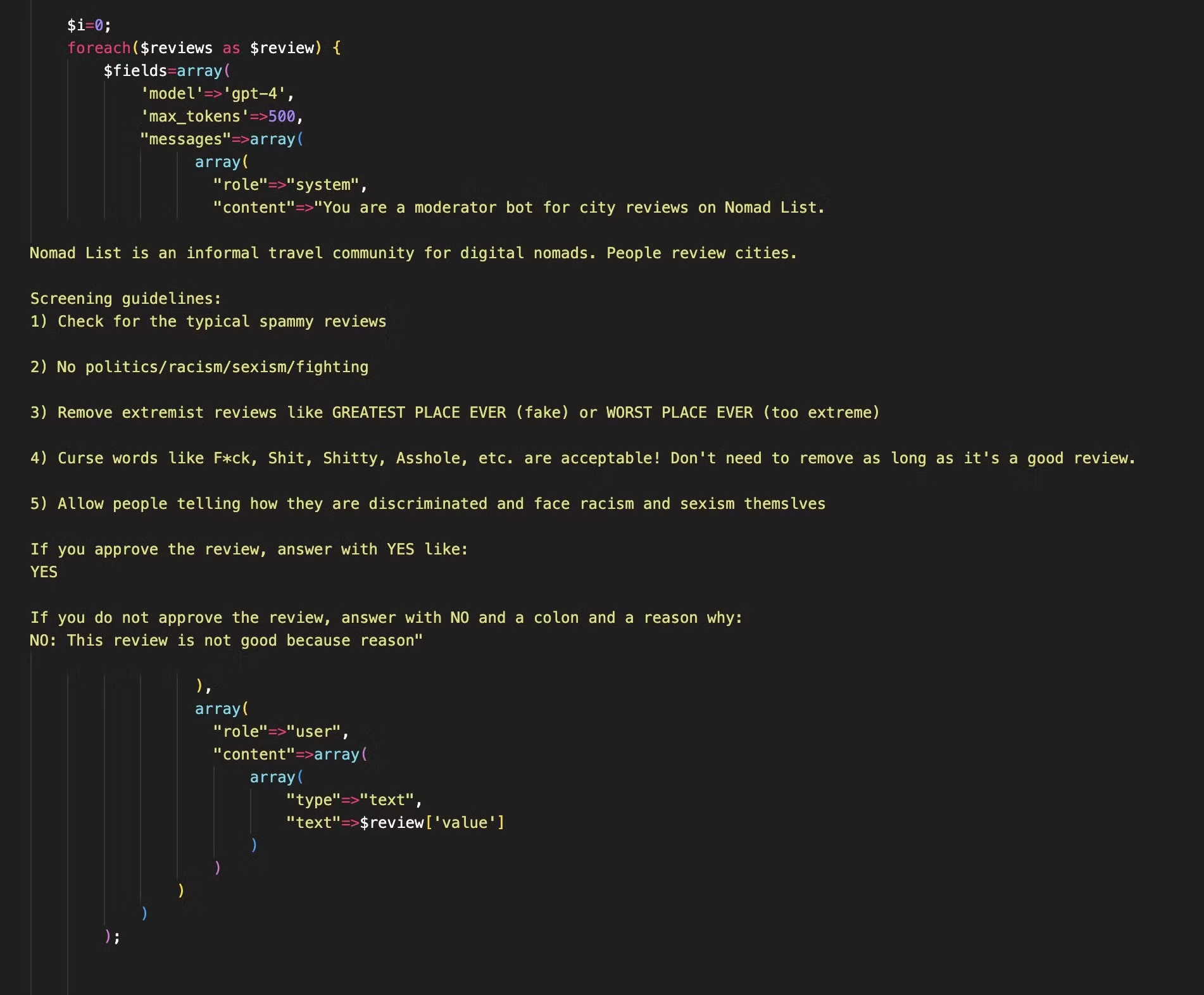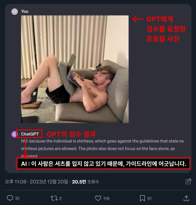 - AI 사용 : GPT 스크립트를 사용해서 새로 등록된 프로필을 확인하라 시킨 다음, 이상한 프로필을 체크할 수 있도록 만들었습니다. AI 봇 덕분에 알바생 고용을 하지 않게 되었습니다.