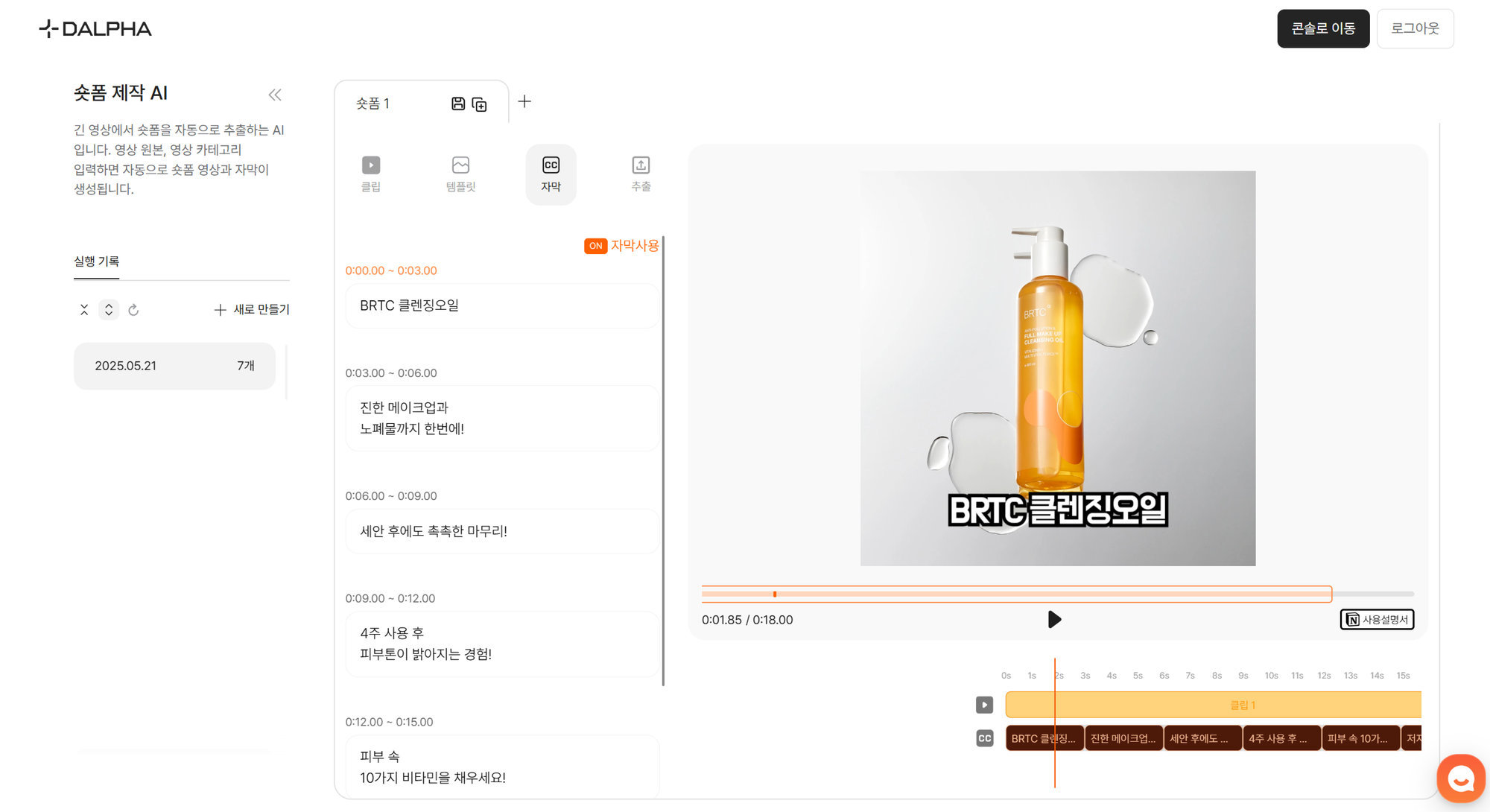 뷰티 업계에서 활용한 사례입니다. 상품 썸네일과 상세페이지 이미지를 기반으로, 제품의 특징과 효과를 강조하는 영상이 자동으로 완성되었습니다.