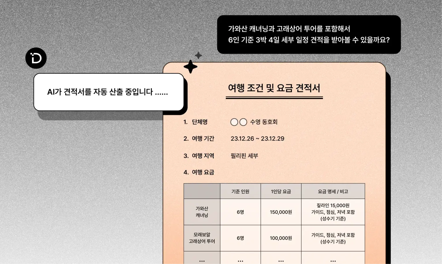 이제 고객이 홈페이지나 챗봇을 통해 여행 견적을 요청하면, 필요한 정보가 자동으로 수집되고 AI가 즉시 맞춤형 견적서 초안을 만들어줍니다.
