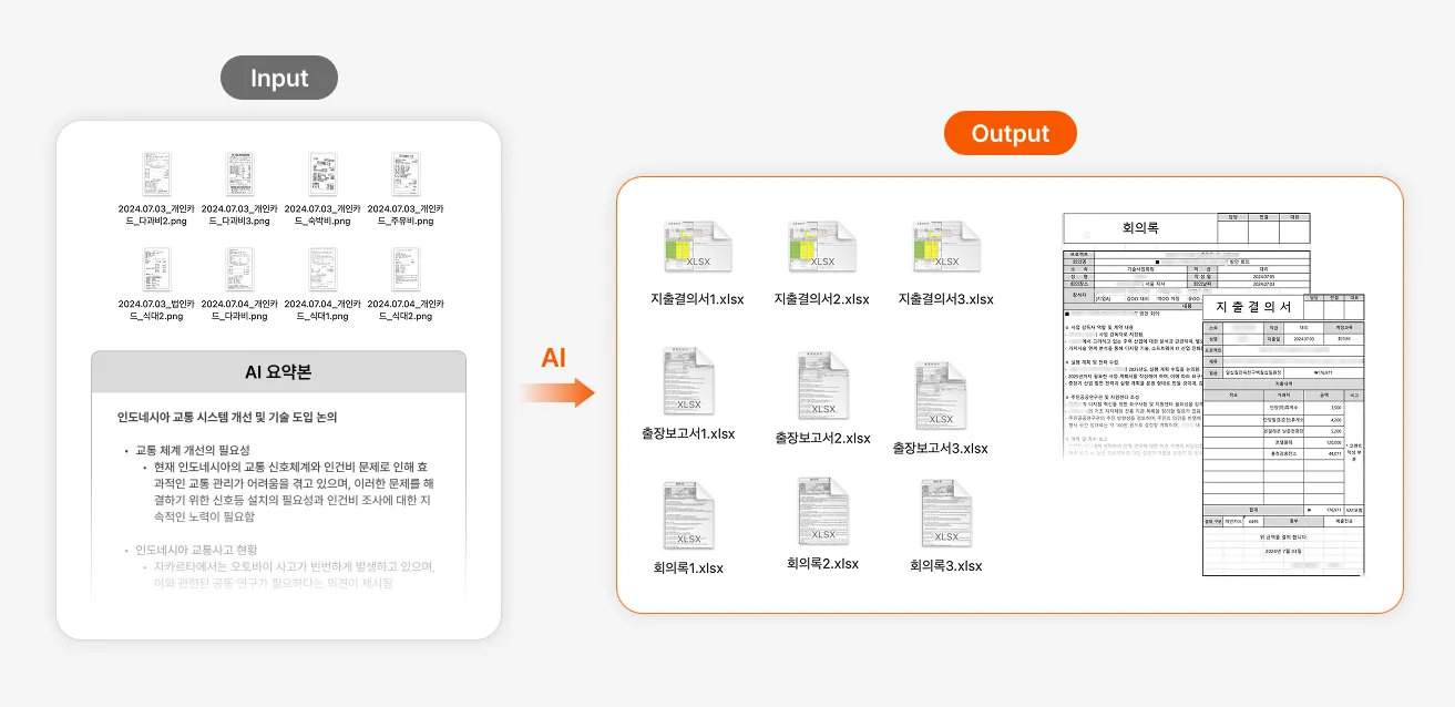 - 거래명세표, 세금계산서, 미팅 녹음, 영수증/전표 등 다양한 문서와 음성 데이터를 AI가 자동 추출·정제해 표준화된 형태로 통합 관리