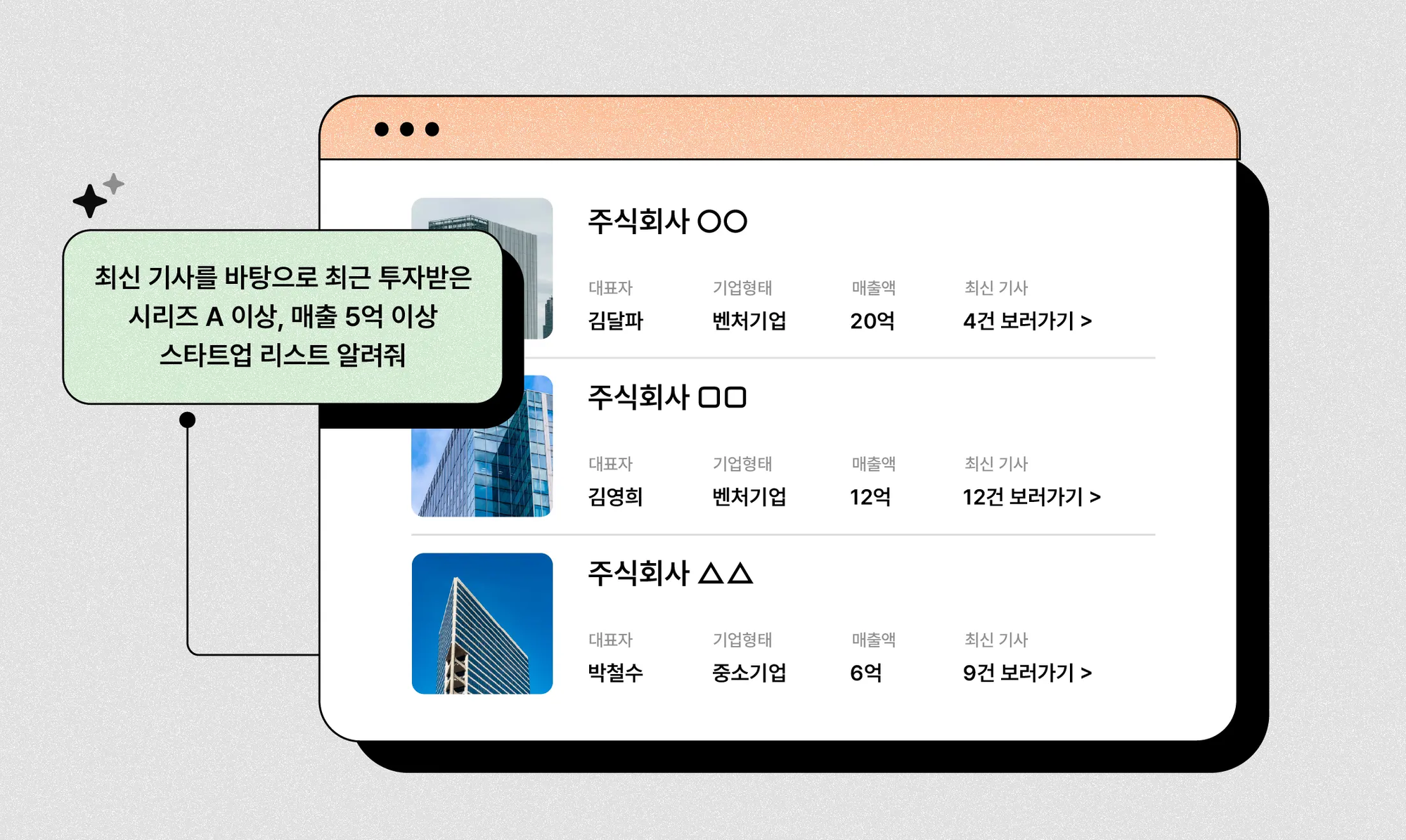 AI가 주요 채널(기업정보 포털, 뉴스, 홈페이지 등)에서 기업 데이터를 실시간으로 크롤링해 산업, 매출, 직원 수 등 주요 기준별로 자동 분류합니다.