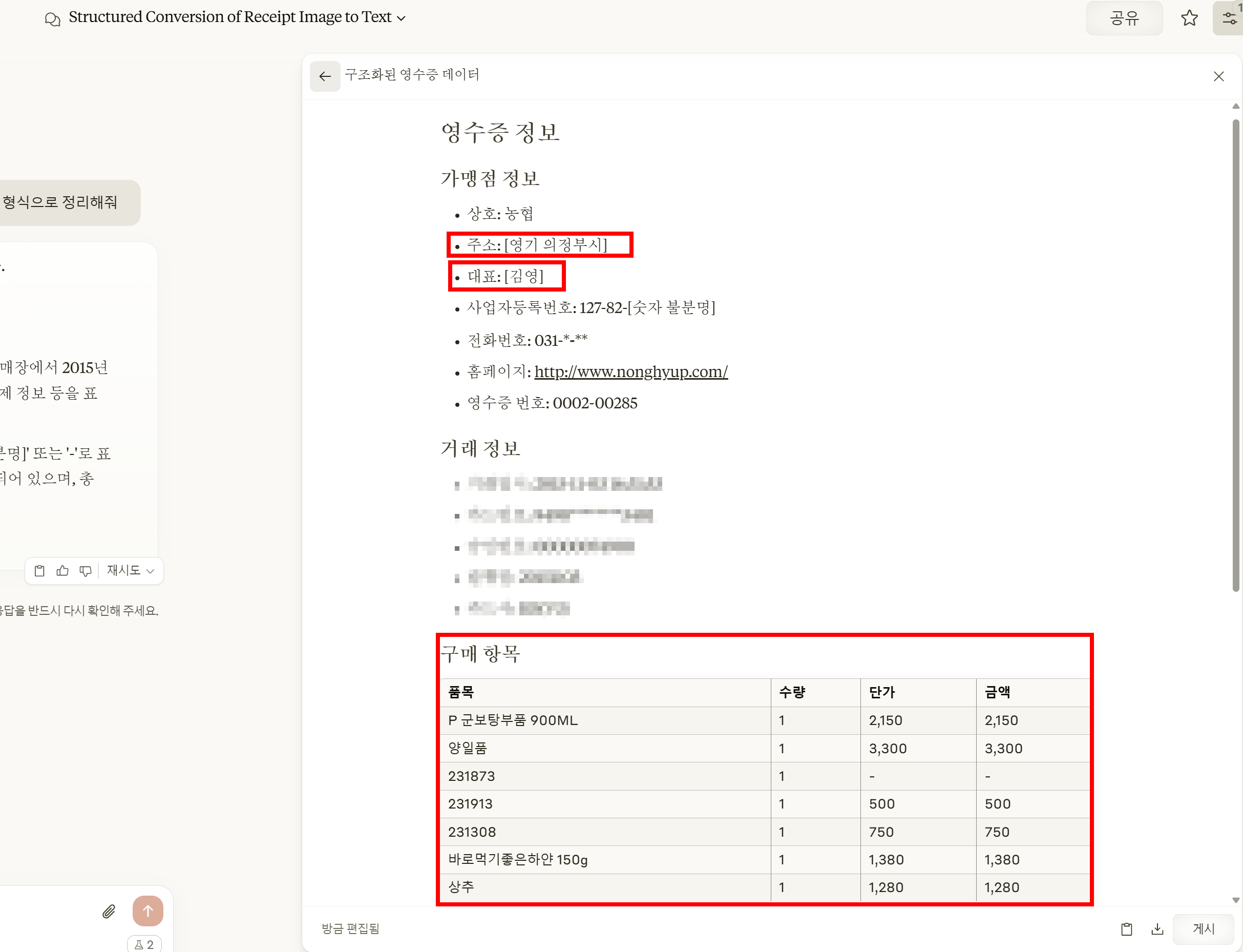 반면, GPT-4o와 Claude 3.7 Sonnet 아쉬움이 많았습니다. 우선 주소와 대표자명 오류가 있었습니다.