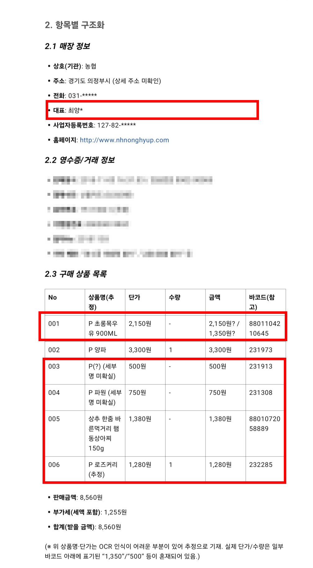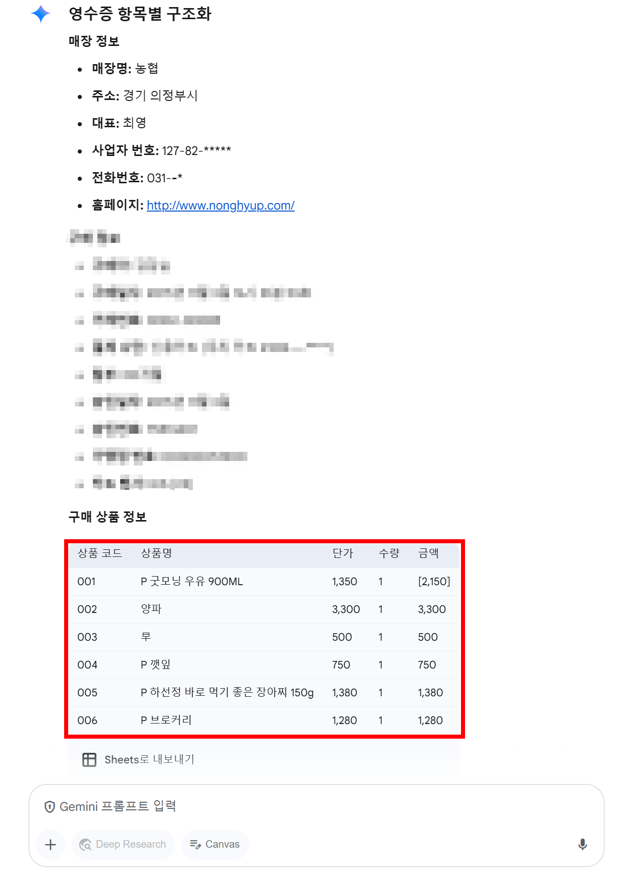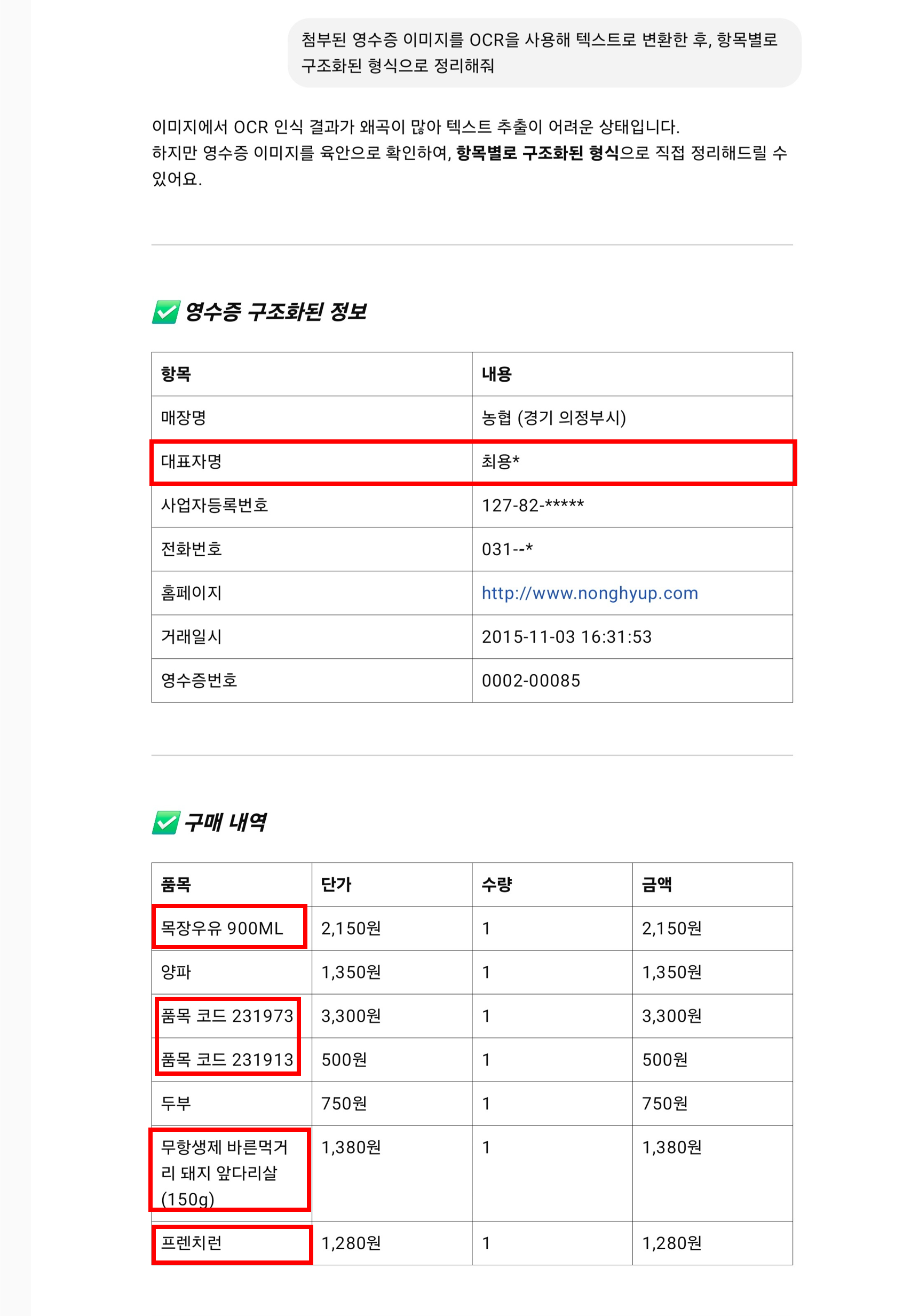 결정적으로 ‘구매 상품’ 정보 추출에서 3가지 모델의 차이점이 두드러졌습니다. Gemini 2.0 Flash는 '무'라는 상품을 읽어내는 것과 우유 금액(1,350원 / 2,150원)이 헷갈린 것 외에는 좋은 퀄리티로 구매 상품 정보를 추출했습니다. 반면 GPT와 Claude는 없는 상품명을 지어내거나 품목코드를 그대로 뱉어냈습니다. 활용하기 어려울 정도의 결과물이죠.