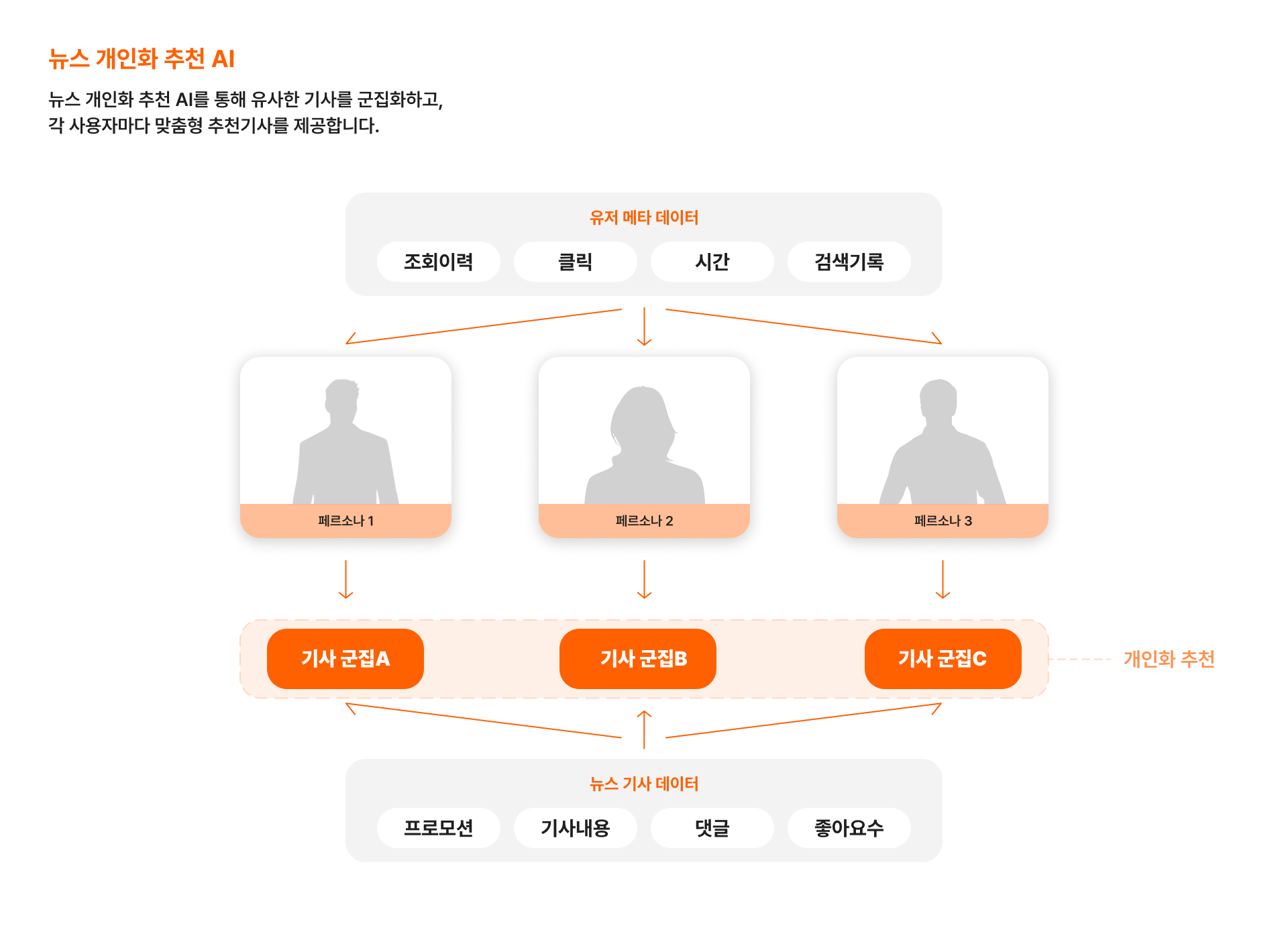 - AI가 뉴스 기사 데이터를 분석해 뉴스를 군집화한 뒤, 사용자별 뉴스 조회 이력·관심사 등 메타 데이터를 분석해 사용자마다 개인화된 뉴스 기사 추천 목록을 제공합니다.
