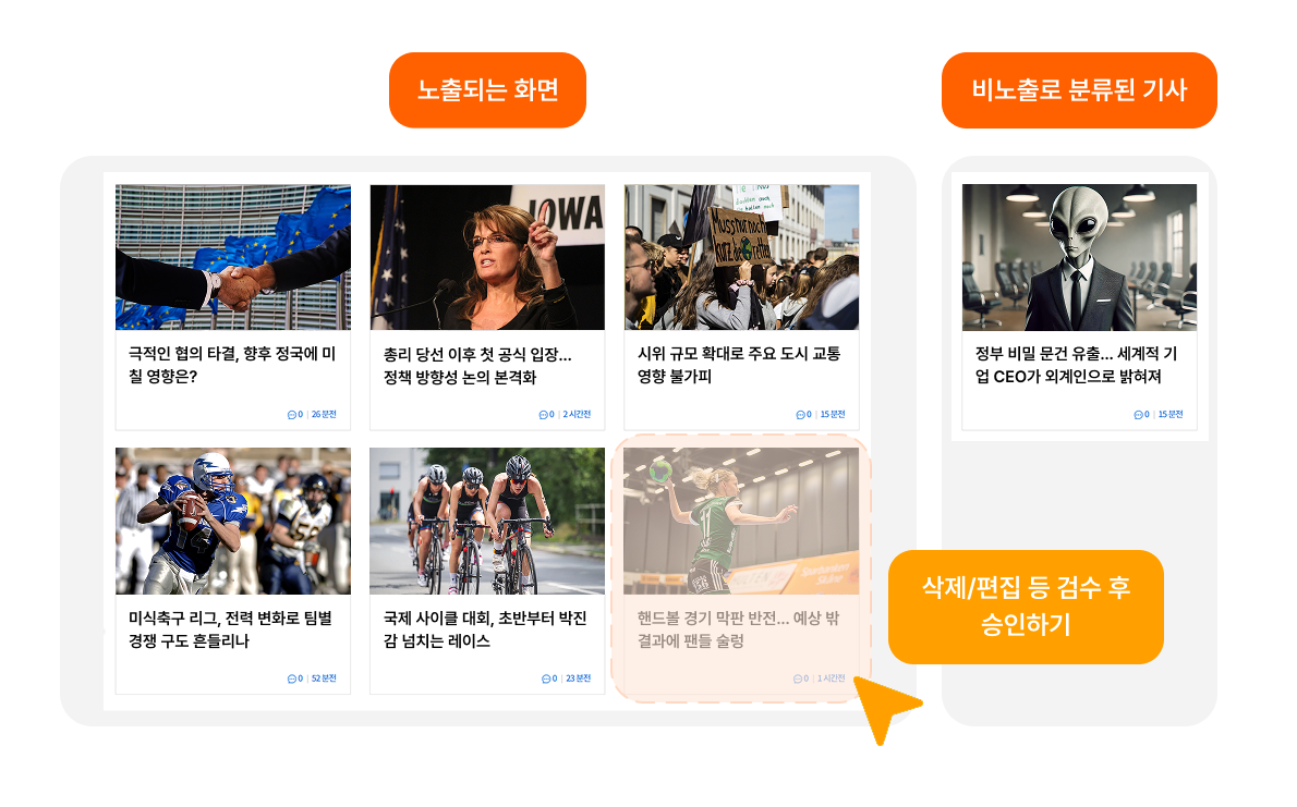 - 대량의 뉴스를 담당자가 일일이 분류하고 노출 여부를 결정해야 해, 시간이 많이 소요되고 인적 오류가 발생할 우려가 있었습니다.