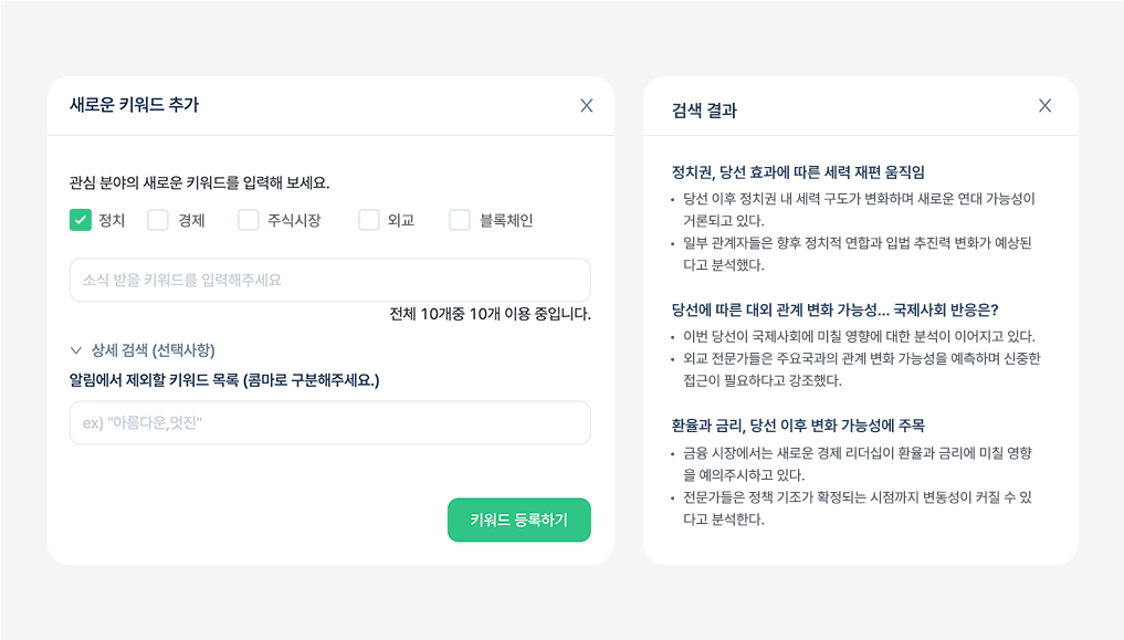 - 팀별·직무별 관심 키워드를 등록해 두면, 수작업 없이도 매일 뉴스가 자동 업데이트됩니다.