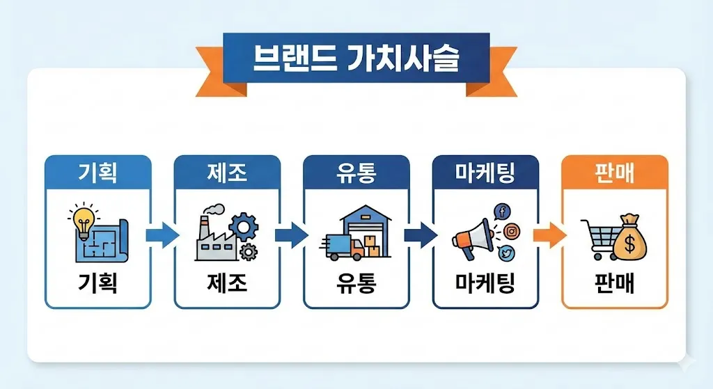 문제는 이렇게 ‘조각 단위’의 AI 활용만으로는 브랜드 전체의 경쟁력을 끌어올리기 어렵다는 점입니다. 브랜드사는 기획 → 제조 → 유통 → 마케팅 → 판매에 이르는 고유의 Value Chain을 가지고 있습니다.