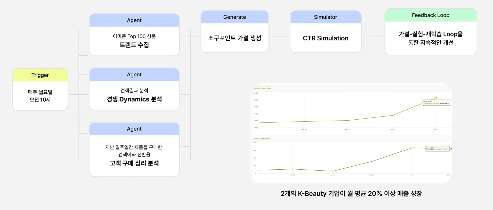이 모든 정보를 바탕으로 AI Agent는 최적화된 상품 소구포인트를 자동 생성합니다. 그리고 여기서 끝나지 않습니다. 경쟁 분석을 토대로 CTR(클릭률)을 시뮬레이션하고, 실제로 2개의 K-뷰티 기업에서 평균 20% 이상의 클릭률 개선을 달성했습니다. 매주 자동으로 분석이 돌아가고, 새로운 개선안을 제시하는 피드백 루프가 구축되는 것이죠.